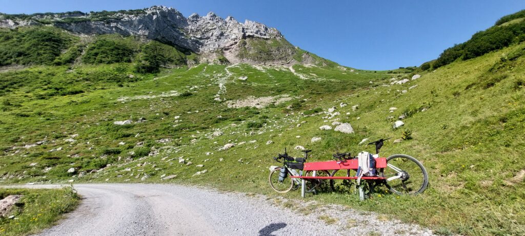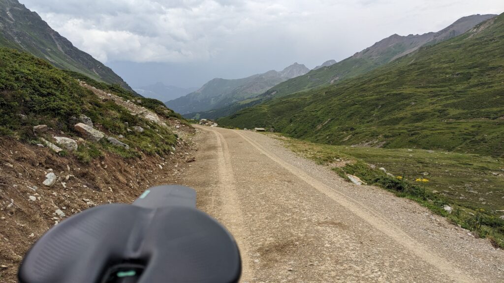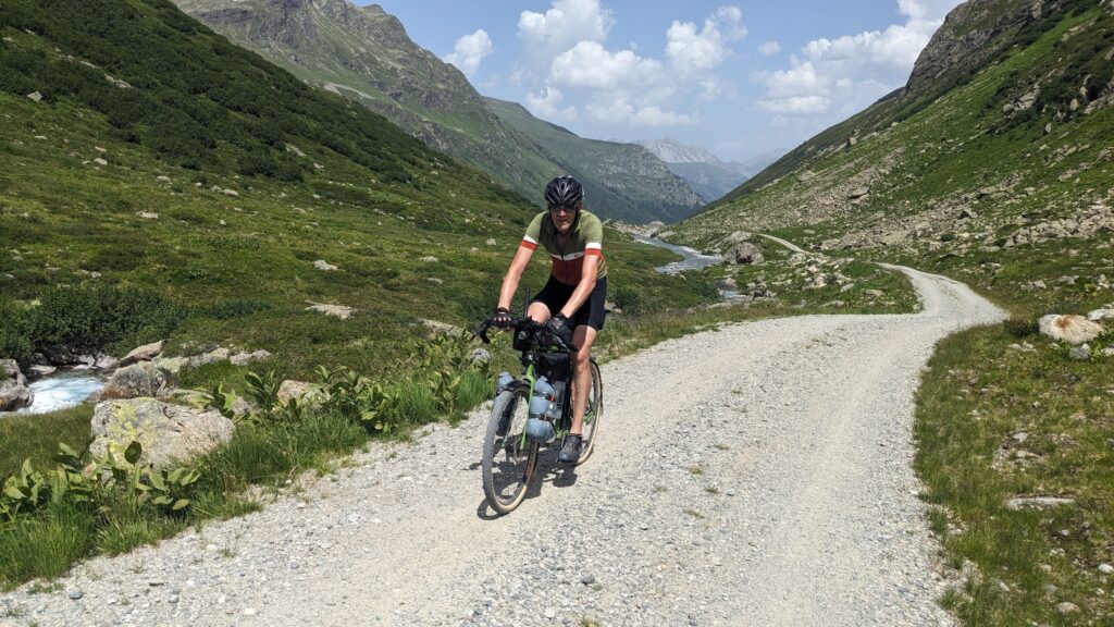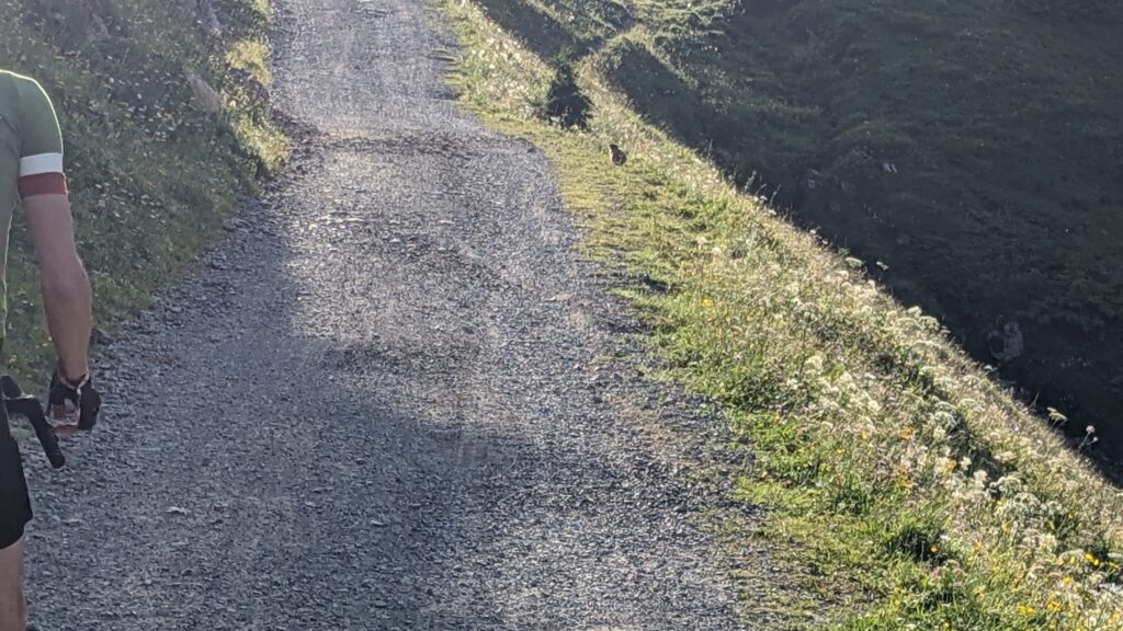 Da der Weg von der Freiburger Hütte direkt hinunter ins Tal zu heftig für unsere Gravelbikes war, mussten wir zunächst ein Stück den Weg zurückfahren, den wir gestern gekommen waren. Also erst einmal die Abfahrt durch den losen Schotter runter. Plötzlich saß vor uns am Wegrand ein relativ großes Murmeltier, so dass wir für ein Foto angehalten haben.