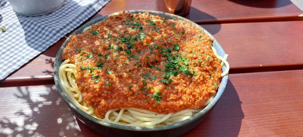 Nur zehn Minuten später stand eine riesige Portion Spaghetti mit Hackfleischsoße vor uns, die konnten wir jetzt wirklich gut gebrauchen.