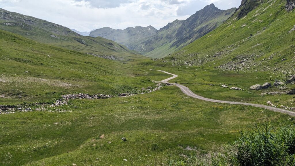 Die Abfahrt war richtig schön, schlängelte sich durch die grünen Wiesen, ringsum die Berge, da komme ich gleich nochmal ins Schwärmen. Weiter Bergab ging es Richtung Stausee Koops, der in einer unwirklich hellblauen Farbe vor uns zu sehen war.