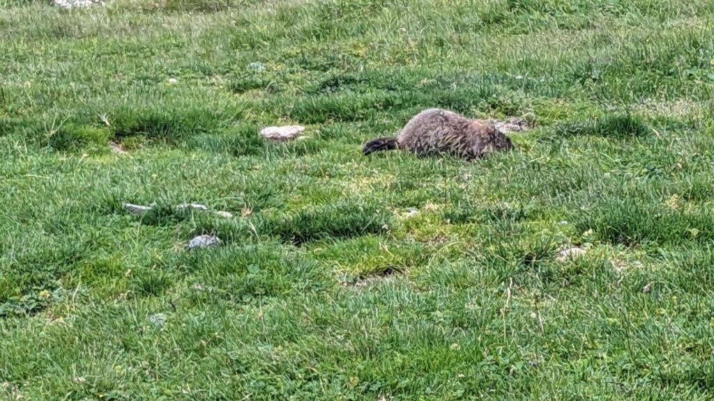 Kurz vor der Hütte hat uns dann ein Landrover von der Hütte überholt und gefragt, ob er uns mitnehmen soll, da wir nur noch wenige Kilometer hatten, haben wir abgelehnt und sind den Rest auch noch hoch zur Hütte gestrampelt. Auf dem Weg gab es natürlich auch wieder unsere Freunde die Murmeltiere.